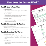 Each lesson includes drawing time, memory verses, and review questions to keep young learners engaged and help them remember what they’ve learned.