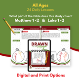 Drawn to the Manger is a hands-on Bible study and activity book designed to help students understand the events surrounding the birth of Jesus, from Gabriel’s visit to Mary to the family’s return to Nazareth. Each of the 24 lessons includes a short Bible reading, a gratitude prompt, and a place to record prayer requests.